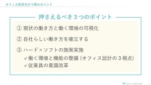 タイトルの通り「オフィス変革を行う際の3つのポイント」になります。11/11(木)に開催されたイナバインターナショナル社主催の「Hybrid Work Fair」にて、