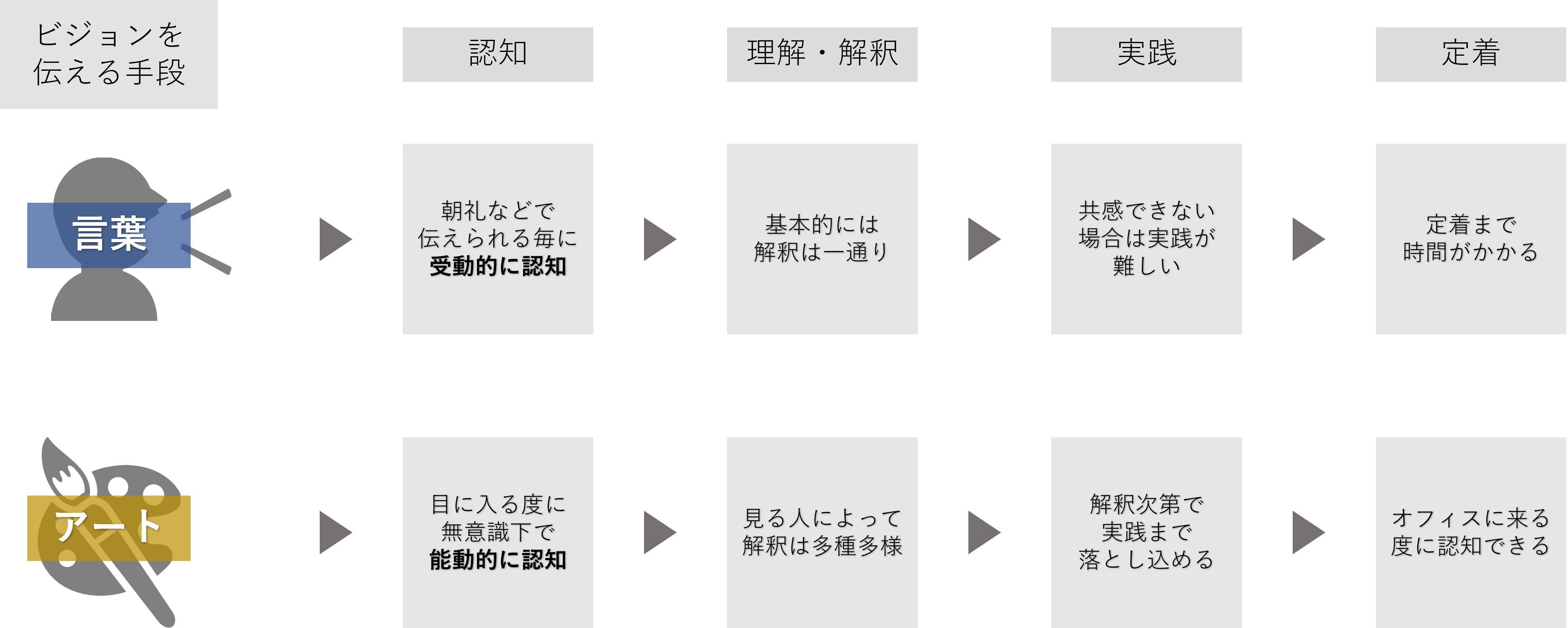 ストーリー性のあるウォールデコレーションは、言葉で表現しきれない企業の個性を表現することができ、かつ、五感を刺激することができます。また、非言語的なアートだからこそ、組織のビジョンやミッションなどを各自で咀嚼し、組織全体で共通のイメージを持つことができると考えます。(添付画像「空間におけるアートの潜在的な効果に関する考え方」参照)
