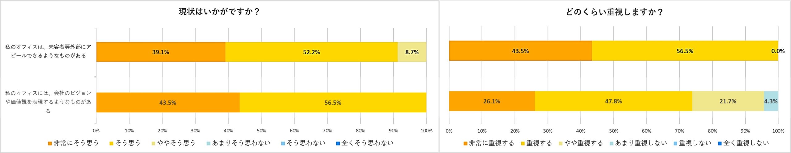 「来客者等外部にアピールできるようなものがある」という設問で、80%が「そう思わない」と回答しました。「会社のビジョンや価値観を表現するようなものがある」という設問でも76%が「そう思わない」と回答しました。また、これを過半数(52%)が「重視する」と回答したことから、理想とする「会社のビジョンや価値観を表現するようなもの」がある環境と、現状のギャップが大きいことが分かりました。
