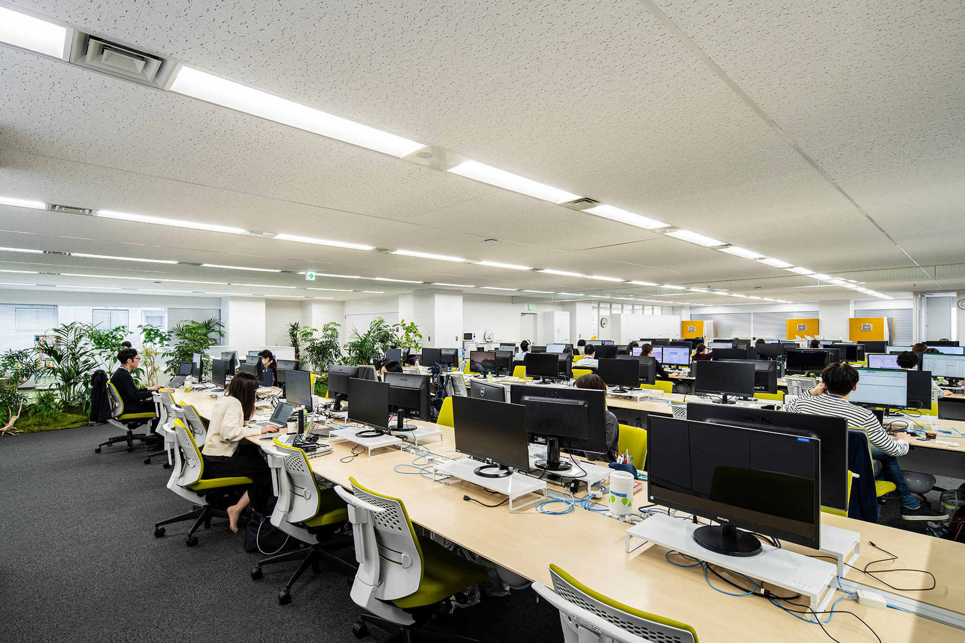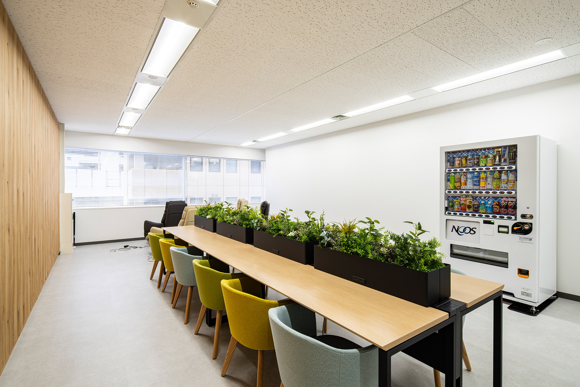 ・観葉植物などのグリーンも多彩にデザインする事で、無機質にならないよう暖かく落ち着いたオフィス空間も演出。